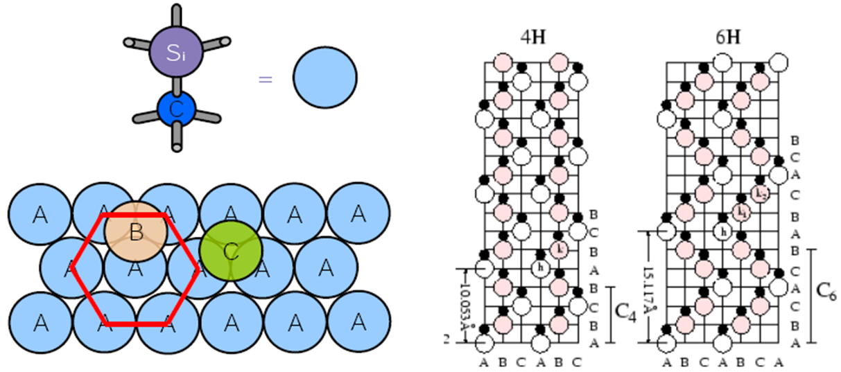 Figure 2. Layer structure of SiC (towards [0001] direction) with (left) tetrahedrally bonded carbon atoms linked to three Si atoms within the bilayer and (right) shown together with the stacking sequences for 4H-SiC and 6H-SiC polytypes. (Click image for full-size view.)